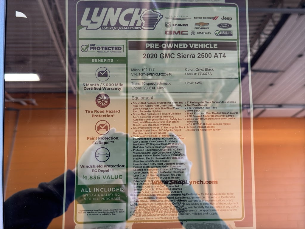 Discover rugged capability and refined comfort with this 2020 GMC Sierra 2500 AT4, located in Burlington, WI. Powered by a robust 6.6L V8 diesel and equipped with 4WD, this heavy-duty pickup delivers class-leading towing, impressive torque, and confident performance whether you're hauling on the highway or working off-road. The AT4 off-road package adds enhanced suspension, skid plates, and hill descent control for serious trail capability without sacrificing on-road refinement.