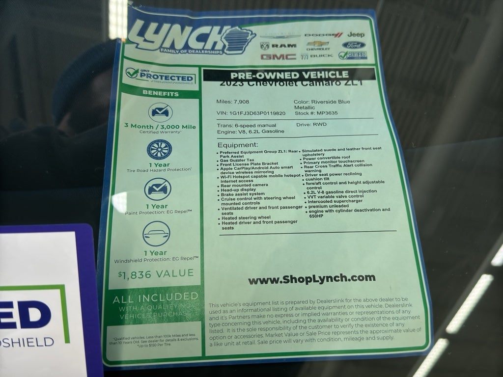 Under the hood is the legendary 6.2L V8 engineered for high-output performance, paired with a responsive automatic transmission and rear-wheel drive for thrilling acceleration and track-ready handling. With only 7,908 miles, this ZL1 has been lightly driven and is primed to provide years of driving enjoyment at a fraction of new-car depreciation.
