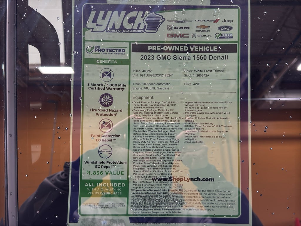 2023 GMC Sierra 1500 Denali — 4WD, V8 5.3L, 40,251 miles. Located in Burlington, WI, this premium pickup delivers commanding presence, refined comfort, and powerful capability at the best price in the area. The celebrated Denali trim combines upscale styling with serious towing and trail performance, driven by a responsive V8 5.3L gasoline engine and a robust four-wheel-drive system that handles Wisconsin weather and weekend adventures with confidence.